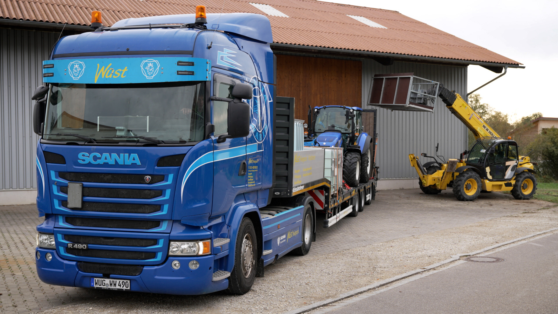 Mit unserem Scania Sattelzug transportieren wir Ihre Land- und Baumaschinen schnell und zuverlässig.